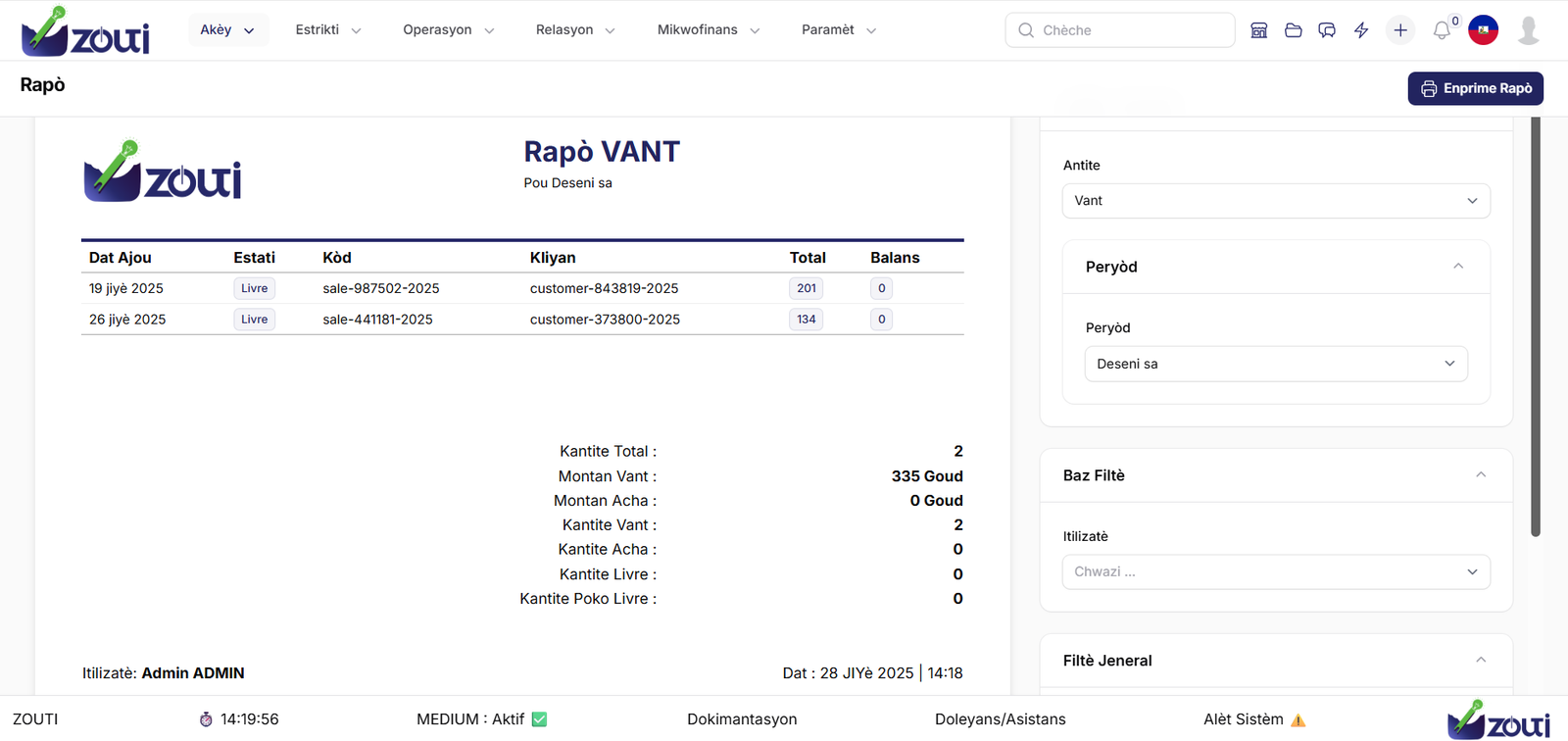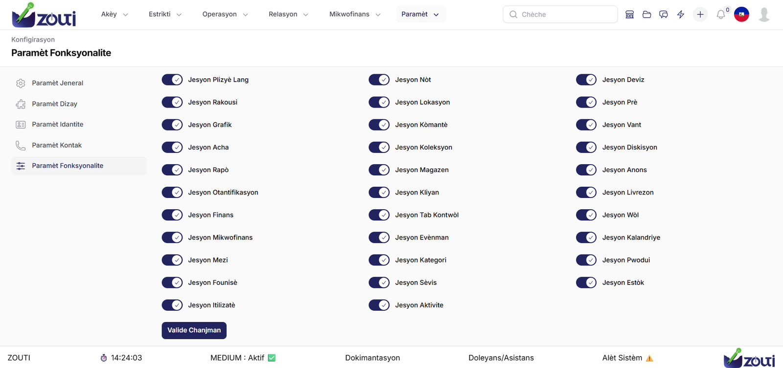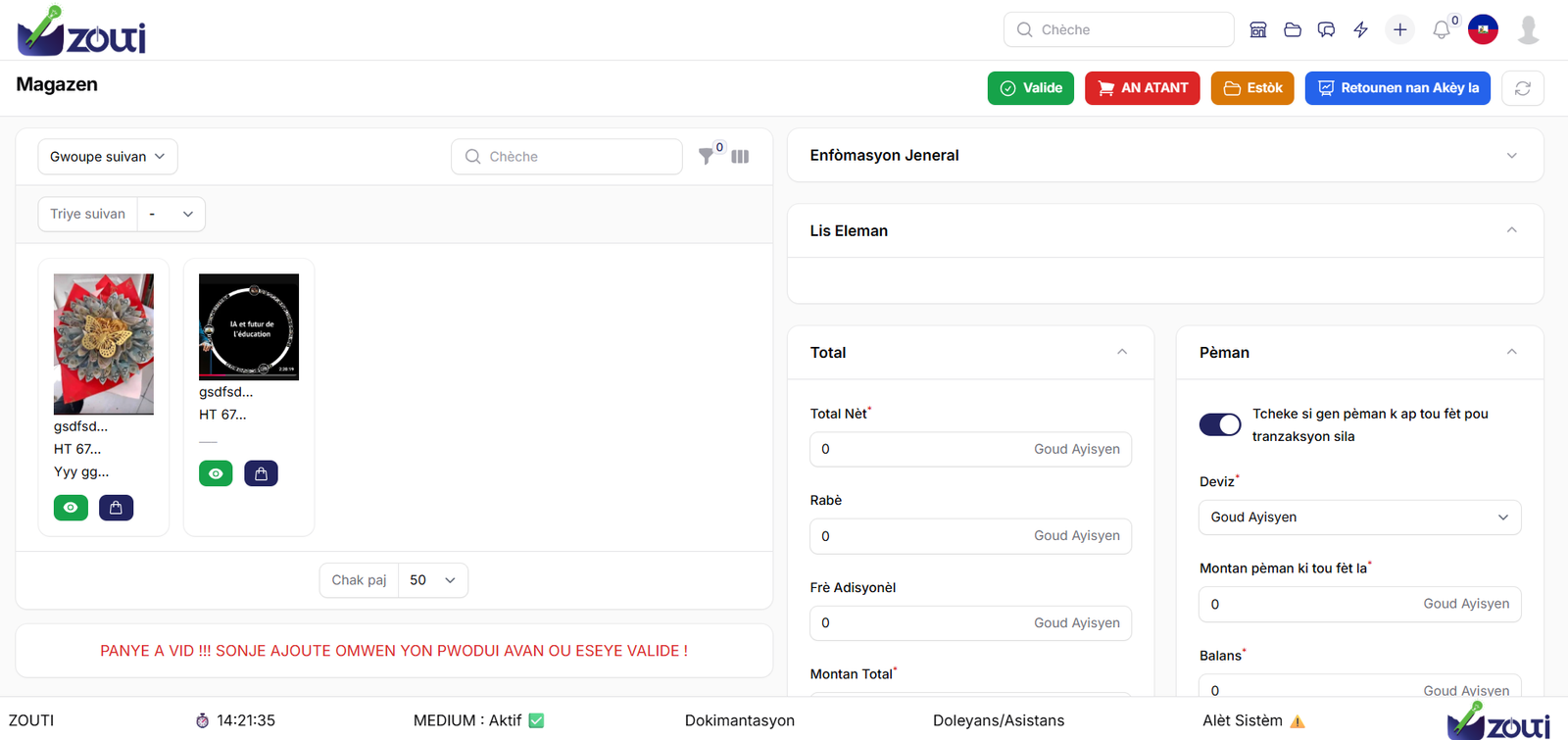 ZOUTI se yon lojisyèl jesyon entegre (ERP) ki fèt pou senplifye epi otomatize tout operasyon biznis ou yo. Kit ou se yon ti, mwayen oswa gwo biznis ann Ayiti, solisyon sa a pèmèt ou santralize lavant, envantè, kòmand ak jesyon finansye sou yon sèl platfòm.